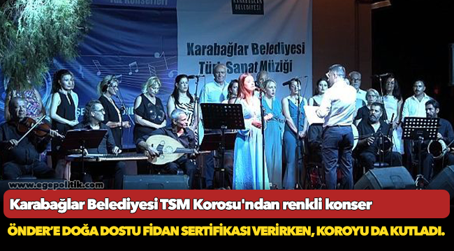 Karabağlar Belediyesi Türk Sanat Müziği Korosu'nun sanat müziğinin birbirinden güzel eserlerini seslendirdiği gecede. koristlerin solo performansı da yoğun alkış aldı. Konser sonunda Karabağlar Belediyesi Başkan Yardımcısı Yaşar Güven Güngörmüş Şef Cihan Önder’e doğa dostu fidan sertifikası verirken, koroyu da kutladı.