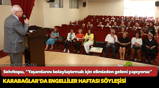 Bozyaka Kültür Merkezi'ndeki etkinlikte konuşan Başkan Selvitopu, Karabağlar nüfusunun yaklaşık 500 bin olduğunu hatırlatarak, “Nüfusumuzun yüzde 14’ü engelli vatandaşlarımızdan oluşuyor. Yani yaklaşık 70 bin civarında değişik engelleri olan insanımız var. Bu insanlarımızın farklı sorunları ve sıkıntıları bulunuyor. Günlük yaşamın içinde çeşitli zorluklarla karşılaşıyorlar. Onların bu sıkıntılarını azaltmak ve yaşamlarını kolaylaştırmak için elimizden geleni yapıyoruz” dedi.