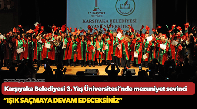Bostanlı Suat Taşer Sanat Merkezi’nde gerçekleşen törende, 60 yaş ve üzeri 105 katılımcı diploma alıp kep atmanın sevincini yaşadı. 3. Yaş Üniversitesi çatısı altında bir yıl boyunca yapılan çalışmaları anlatan film ve mezunların sergiledikleri gösteriler de büyük ilgiyle izlendi. Ayrıca Karşıyaka Belediye Başkanı Dr. Cemil Tugay; Türkiye’de ilk kez bir belediye tarafından yaşama geçirilen 3. Yaş Üniversitesi’ne katkılarından dolayı Ege Geriatri Derneği Başkanı Doç. Dr. Sevnaz Şahin’e, Ege Üniversitesi Tıp Fakültesi İç Hastalıkları Anabilim Dalı Başkanı Prof. Dr. Fehmi Akçiçek’e ve projenin bağışçısı İzmir Güneş Ecza Deposu adına Hüseyin Baysan’ı temsilen İzmir Güneş Ecza Deposu Müdürü İbrahim Armağan’a teşekkür plaketi takdim etti. Büyük coşkuya sahne olan törenin finali, sanatçı Atilla Atasoy’un konseriyle yapıldı. Çınarlar, Atasoy’un seslendirdiği şarkılara eşlik ederek mezuniyetlerini kutladı.