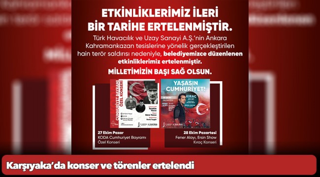 Karşıyaka Belediye Başkanı Yıldız Ünsal “Başkentimiz Ankara’nın Kahramankazan ilçesinde Türk Havacılık ve Uzay Sanayii A.Ş. tesislerini hedef alan hain terör saldırısını lanetliyor, şehitlerimize Allah’tan rahmet diliyorum. Milletimizin başı sağ olsun. Biz bu acı günlerde, Ulu Önderimiz Gazi Mustafa Kemal Atatürk’ün kurduğu Cumhuriyetimize tüm gücümüzle sahip çıkacak, iç ve dış terör odaklarının karşısında dimdik durup aydınlık günlerde bayramlarımızı gururla kutlamaya devam edeceğiz” dedi.