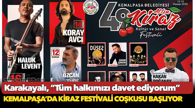 Kemalpaşa Belediye Başkanı Rıdvan Karakayalı festival ile ilgili yaptığı açıklamada, "Pandemi nedeniyle iki yıldır gerçekleştiremediğimiz Kiraz Festivali coşkusunu bugün başlayan etkinliklerle beş gün boyunca kesintisiz yaşayacağız. Çevre ilçelerden ve şehir dışından birçok kişi festival kapsamında ilçemizi ziyaret edecek. Kemalpaşamızı ve Coğrafi İşaretli Kemalpaşa Kirazı'nı tanıma şansı bulacak. Amacımız hem doğal güzelliklerimizi tanıtmak hem de vatandaşlarımızın ekonomisine katkıda bulunmak. Tüm halkımızı festivale davet ediyorum" dedi.