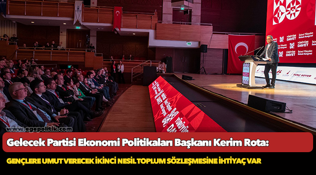 Gelecek Partisi Ekonomi Politikaları Başkanı Kerim Rota, İzmir Büyükşehir Belediyesi tarafından düzenlenen İkinci Yüzyılın İktisat Kongresi’nde “Son Yüzyılda Tasarruflarla İmtihanımız: İkinci Yüzyılda Ne Yapılmalı?” başlıklı bir konuşma yaptı. Kerim Rota, dünyada en büyük ekonomik sorunun enflasyonun ardından, gelir veya servet dağılımı bozukluğu olduğunu belirtti. Servet dağılımı konusunda durumun gençler açısından vahim bir noktaya geldiğini anlatan Rota, gençlerin bu kısır döngüden kurtulması için bir şeylerin yapılması gerektiğini ifade etti.
