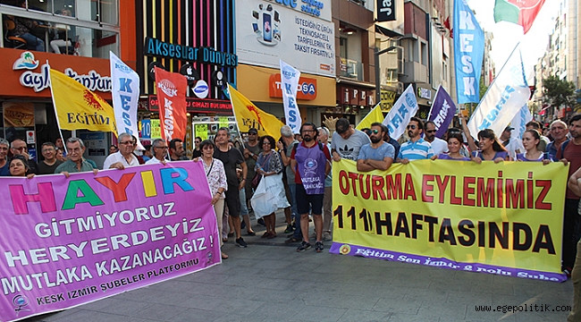 İzmir’de KHK’ler ile ihraç edilen kamu çalışanlarının yaklaşık 2 yıl önce başlattıkları oturma eylemi, 111’nci haftasını geride bıraktı. Bugün saat 18.30’da Karşıyaka iskele karşısında buluşan kamu çalışanları oturma eylemi gerçekleştirdi. KESK İzmir Şubeler Platformu ve Eğitim Sen İzmir adına basın açıklamasını okuyan Eğitim Sen 2 No’lu Şube Başkanı Hasan Ali Kılıç, “Halkın iradesi İstanbul’da adaletii sağladı. Şimdi sırada hukuksuz ihraç edilen arkadaşlarımız için güçlerimizi birleştirerek adaleti kazanmak var” dedi.