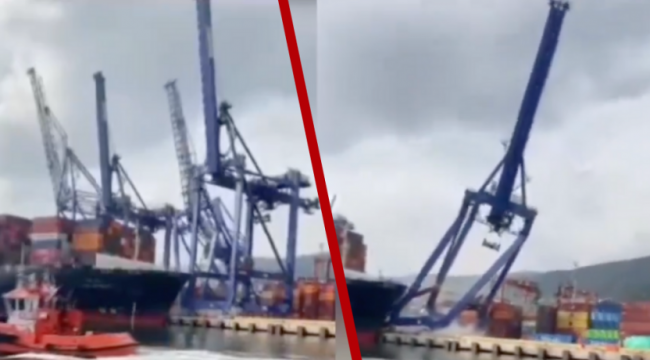 Kocaeli'nin Körfez ilçesinde bulunan Evyapport Limanı'na yanaşan geminin kıyıya çarpması nedeniyle vinçler devrildi.