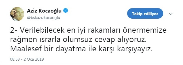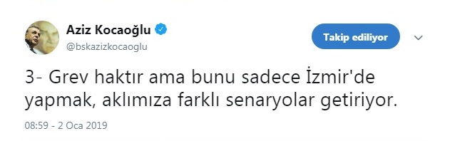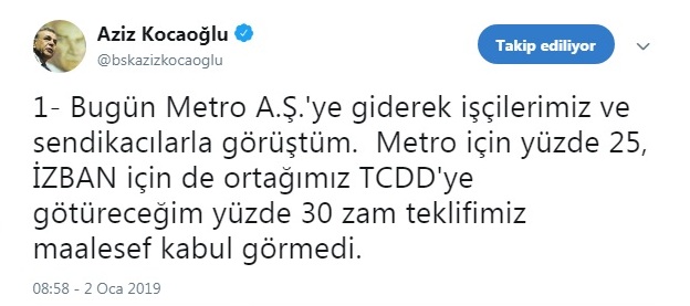 Twitter hesabından da açıklamalarda bulunan Kocaoğlu, "Bugün Metro A.Ş.'ye giderek işçilerimiz ve sendikacılarla görüştüm. Metro için yüzde 25, İZBAN için de ortağımız TCDD'ye götüreceğim yüzde 30 zam teklifimiz maalesef kabul görmedi. Verilebilecek en iyi rakamları önermemize rağmen ısrarla olumsuz cevap alıyoruz. Maalesef bir dayatma ile karşı karşıyayız. Grev haktır ama bunu sadece İzmir'de yapmak, aklımıza farklı senaryolar getiriyor." diyerek bugün bazı basın kuruluşlarında yer alan iddialara da atıfta bulundu.