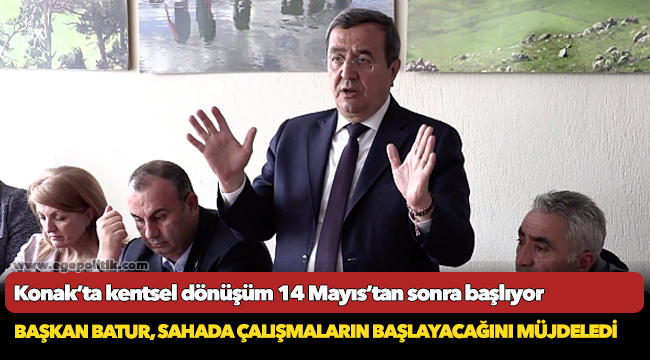 Yaklaşan cumhurbaşkanlığı seçimi öncesi yoğun bir programla ilçedeki sivil toplum örgütleri ile esnaf kuruluşlarıyla görüşen Konak Belediye Başkanı Abdül Batur, kentsel dönüşüm mahallerinde bulunan dernek ve federasyonlara yaptığı ziyaret sırasında sahada başlayacak çalışmalar için tarih verdi. Batur, 14 Mayıs’ın ardından planların askıya çıkacağını ve imza sürecini ilk tamamlayan bölgeden kentsel dönüşüm başlayacağını müjdeledi.