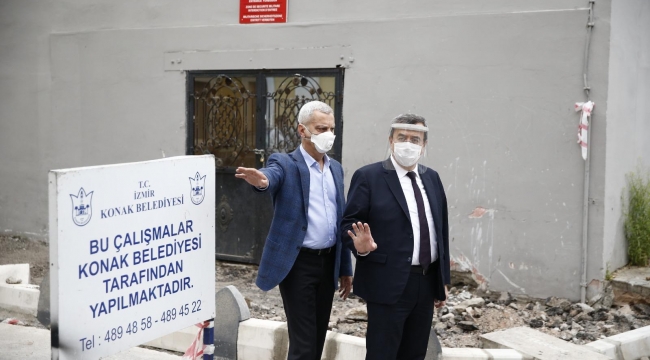 Konak Belediyesi, salgın nedeniyle sokaklardaki trafik ve insan yoğunluğunun azaldığı ilçede yol, kaldırım, merdiven yenileme çalışmalarına hız kesmeden devam ediyor.