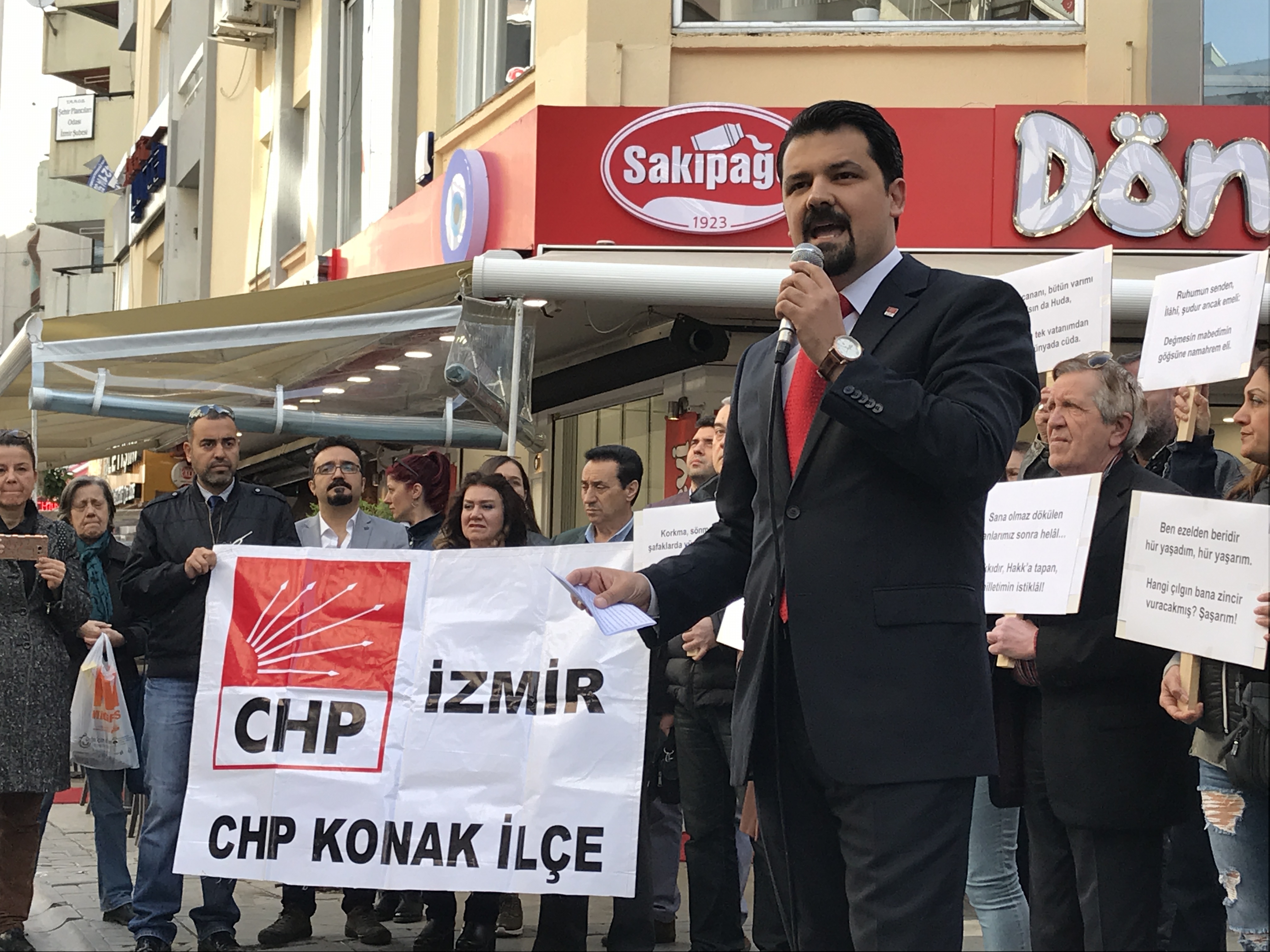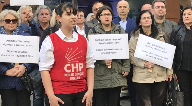 Basın açıklaması öncesinde CHP Konak Çocuk Kollu Başkanı Tuana Lina Başak, İstiklal Marşı'nın on kıtasını ezbere okuyarak, büyük alkış aldı. Başkan Gruşçu: " Bizden sonra yetişen çocuklarımızın sahip çıkacağı İstiklal Marşı sahipsiz değil, asla sahipsiz kalmayacak!." Eylemde İstiklal Marşı dizelerini pankart olarak tutan partililer Çanakkale Şehitleri'ni saygı duruşuyla anarak, ardından İstiklal Marşı okudu.