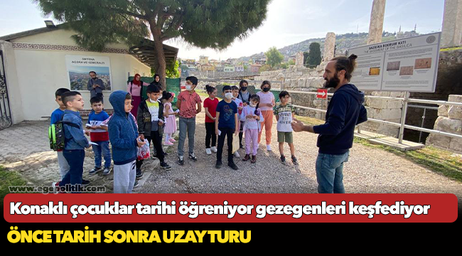 Konak Belediyesi’nin semt merkezlerinde kurslara katılan öğrenciler için düzenlenen program kapsamında çocuklar, önce Smyrna Antik Kenti Agorası’nda tarih gezisine katılarak kentin tarihini öğreniyor, ardından Konak Belediyesi Yenilikçi Öğrenme Merkezi’ndeki (KONTAK) planetaryumda uzay cisimlerini ve gezegenleri keşfediyor. Öte yandan çocuklar, KONTAK bünyesinde hazırlanan bir diğer program ile teknoloji, sanat, sayısal bilimler ve astronomi atölyelerine katılıyor.