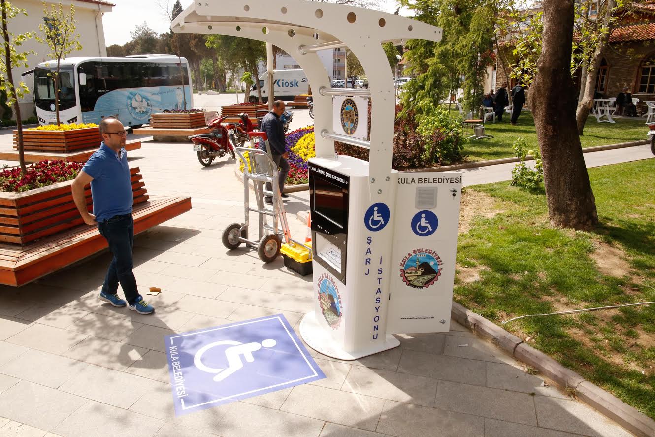 Sosyal belediyecilik anlayışı ile vatandaşların hayatını kolaylaştırmaya yönelik çalışmalar yürüten Kula Belediyesi, engelliler için hizmetlerine bir yenisini daha ekledi. Salihli Ticaret ve Sanayi Odası’nın desteğiyle ilki Kula Belediyesi’nin önünde kurulan ‘Akülü Araç Şarj İstasyonu’, ilçede yaşayan engelli vatandaşlara ve yolu Kula’dan geçen tüm engellilere hizmet verecek. Akülü sandalye kullanan engelli vatandaşların araçlarını rahatça şarj edebilecekleri istasyon, aynı zamanda vatandaşlara bu noktada şarj ünitesine bağlı ekrandan sesli ve görüntülü video izleme imkanı da sunuyor. Yeni kurulan engelli aracı şarj istasyonunu inceleyen Kula Belediye Başkanı Hüseyin Tosun, şarj istasyonun özellikleri hakkında yetkililerden bilgi aldı.