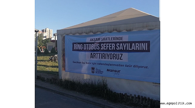 Ring otobüs duraklarında teftişe çıkan Ankara Büyükşehir Belediye Başkanı Mansur Yavaş, vatandaşların şikayetleri üzerine durakları "özür dileriz" pankartı ile donatıp ring otobüs sefer sayılarını akşam saatlerinde artırdıklarını duyurdu.