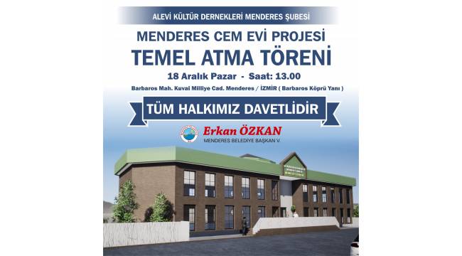Menderes Belediyesi ve Alevi Kültür Dernekleri Menderes Şubesinin işbirliği ile Menderes Cemevinin temeli, 18 Aralık Pazar günü saat 13.00’te gerçekleşecek törenle atılacak.