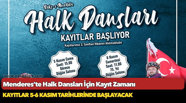 Menderes Belediyesi Halk Dansları Topluluğu tarafından verilecek halk dansları kursları için 5 Kasım Cuma günü Görece Spor Salonu, 6 Kasım Cumartesi günü 75. Yıl Düğün Salonu’nda kayıtlar alınacak. Menderes’te ikamet eden, ilköğretim ikinci sınıftan itibaren her yaştan insanın katılabileceği eğitimler ücretsiz olacak. Kasım ayında başlayacak kurslar Haziran ayında sona erecek.