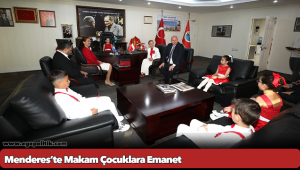 Menderes Belediyesi’nde 23 Nisan Ulusal Egemenlik ve Çocuk Bayramı’nın geleneksel uygulaması ile çocuklar başkanlık makamına oturdu. Belediye Başkanı İlkay Çiçek makamını Cumaovası İlköğretim Okulu 4. Sınıf çocuklarından Deniz Hayat Tür, Elif Hifa Avcı, Mahir Arda Çınar, Mehmet Emir Küçüker ve Mira Salış’a emanet etti.