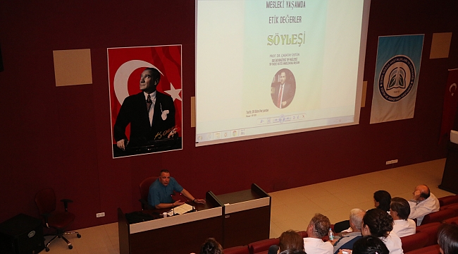 Ege Üniversitesi Tıp Tarihi ve Etik Anabilim Dalı Başkanı Prof. Dr. Çağatay Üstün’ün katılımıyla, Sağlık Bakanlığı Sağlık Bilimleri Üniversitesi Dr. Suat Seren Göğüs Hastalıkları ve Cerrahisi Eğitim ve Araştırma Hastanesi’nde çalışanlara yönelik “Mesleki ve Sosyal Yaşamda Etik Değerler” konulu bir söyleşi düzenlendi.