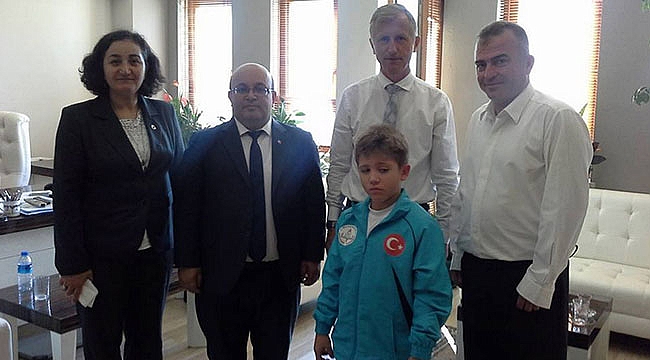 Reha Midilli İlkokulu 3. sınıf öğrencisi Kaan Yüksel’in ziyaretinde antrenörü ve babası Kudret Yüksel, Foça İlçe Milli Eğitim Müdürü Yüksel Akar ile Milli Eğitim Şube Müdürü Beyhan Gökdemir’ de hazır bulundu.