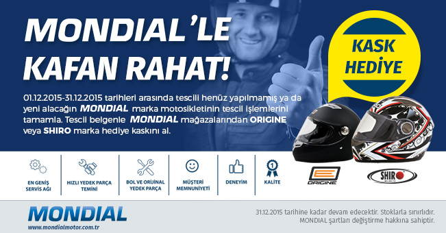 Kask kullanımını yaygınlaştırmayı ve sürücülerine kask kullanım alışkanlığını kazandırmayı amaçlayan Mondial, Aralık ayı boyunca model yılı fark etmeksizin, tescili henüz yapılmamış ya da yeni alacağı Mondial marka motosikletin tescil işlemlerini tamamlayan herkese “Shiro” ve “Origine” kask çeşitlerinden birini hediye ediyor.