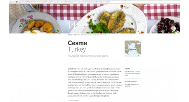Amerika Birleşik Devletleri'nde yayın yapan dünyanın en prestijli yayın organlarından The New York Times, okurları için “2016'da Gidilmesi Gereken 52 Yer”in listesini yayınladı. 7 Ocak tarihiyle yayınlanan yazıda, dünyada tarih, kültür, mimari, gastronomi, spor ve doğal güzellikler gibi farklı alanlarda öne çıkan turizm destinasyonları önerildi, "Mutlaka gidin" denildi. Listeye Türkiye'den ise sadece tek bir adres, İzmir’e bağlı Çeşme ilçesi girebildi.