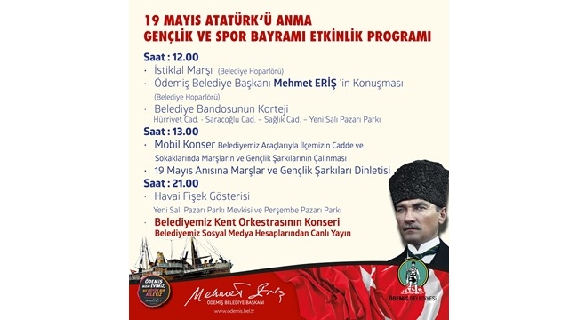 Ödemiş Belediye Başkanı Mehmet Eriş, “19 Mayıs Atatürk'ü Anma Gençlik ve Spor Bayramımızın 101. yılında Mustafa Kemal'in öğrencileri olarak gençliğin enerjisi ve heyecanıyla balkonlarımızda olalım. Bu coşkuyu tıpkı 23 Nisan'da olduğu gibi yine hep birlikte paylaşalım. Bayram sevinci ile balkonlarımızı Şanlı Bayrağımızla donatalım” dedi.