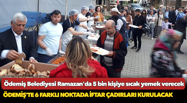 Ödemiş Belediyesi tarafından bu yıl kent merkezinde 6 ayrı mahallede iftar çadırları kurularak, günde 5000 kişiye sıcak yemek verilecek. Hükümet Meydanı, Türkmen Mahallesi Perşembe Pazarı, Cumhuriyet Mahallesi Köşebaşı Camii yanı, Zafer Mahallesi Tekstil mevki, Hürriyet Mahallesi Muhtarlık Ofisi yanı ve Üç Eylül Mahallesi Gençlik Caddesi'nde kurulacak iftar çadırları için hazırlıklar tamamlandı. Ramazan ayı boyunca her gün hayırseverlerin katkılarıyla hazırlanan sıcak yemek verilecek. İftar çadırlarında hazırlanan menünün protein, vitaminler ve kalori olarak dengeli ve sağlıklı beslenmeye uygun bir şekilde oluşmasına özen gösterilecek.