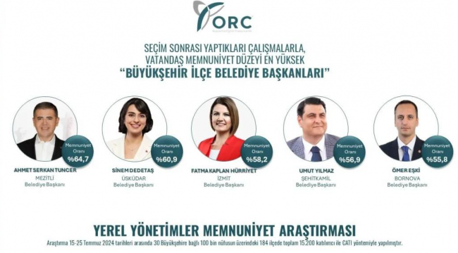 Seçmenlere yaşadıkları ilçenin belediye başkanından ne düzeyde memnun oldukları soruldu. Memnuniyet düzeyi en yüksek ilk 5 büyükşehir ilçe belediyesi şöyle: