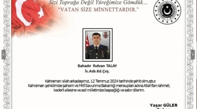 Milli Savunma Bakanlığı, Karga Kayası Harekatı bölgesinde bölücü terör örgütü üyelerinin yerleştirdiği el yapımı patlayıcının (EYP) patlaması sonucu Başçavuş Bahadır Rıdvan Talay'ın şehit olduğunu duyurdu.