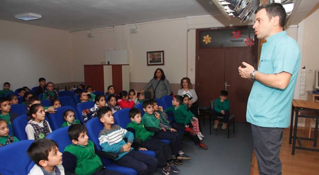 Çocukların hayvan sevgisi ile büyümesi ve özellikle sokak hayvanları için farkındalık ve duyarlılık geliştirmeleri amacıyla başlatılan seminerlerin ilki Kocatepe Mehmet Lütfiye Dönmez İlköğretim Okulu'nda gerçekleştirildi. Konak Belediyesi Veteriner Müdürlüğü’nde görevli Veteriner Hekim Ömer Şimşek, minik öğrenciler için eğlenceli bir sunum yaptı. Okulun 2. sınıf öğrencilerinin katıldığı seminerde Şimşek, çocuklara evde hayvan bakımı, sokak hayvanlarının korunması konularında bilgilendirmelerde bulundu. Evde kedi veya köpek besleyenlerin sevimli dostları için mutlaka karne çıkarması gerektiğini belirten Şimşek, miniklere sokak hayvanlarını severken dikkat edilmesi gereken hijyen şartları konusunda eğitici bilgiler de verdi. Hayvan hakları konusuna da değinen Şimşek, minik öğrencilere sokakta yaralanmış, kaza geçirmiş bir hayvan gördüklerinde öğretmenleri veya ailelerini Hayvan Sağlığı Merkezi'ne telefon etmeleri yönünde uyarmalarını söyledi.