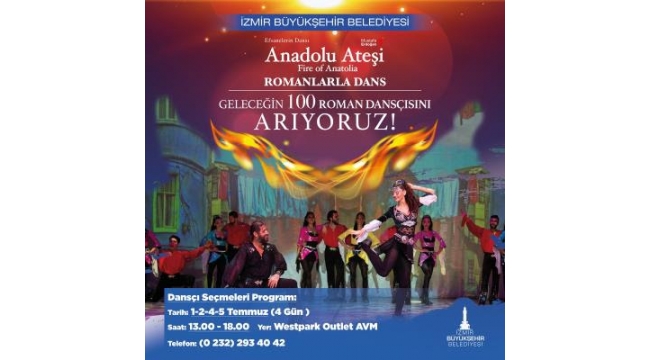 İzmir Büyükşehir Belediyesi ve Anadolu Ateşi Dans Topluluğu’nun gerçekleştireceği Romanlarla Dans projesi dansçı seçmeleri 1 Temmuz Çarşamba günü Anadolu Ateşi Westpark Dans Okulu’nda başlıyor.