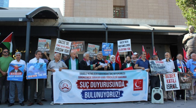 Bayraklı'daki İzmir Adalet Sarayı önünde bir araya gelen Saadet Partililer, "İsrailli yetkililer hakkındaki suç duyurumuzu sürüncemede bırakan kamu görevlileri hakkında suç duyusunda bulunuyoruz" yazılı pankart açtı.