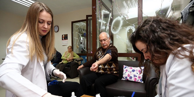 Konak Belediyesi’nin Ziya Zişan Saadet Aytulun Kardeşler İleri Yaş Sağlıklı Yaşam Merkezi’ne üye olan 55 yaş ve üzeri yaklaşık 500 kursiyer için ücretsiz sağlık kontrolü hizmeti başlatıldı. Halil Rıfat Paşa semtinde faaliyet gösteren merkezde onlarca kursa ve aktiviteye katılan kursiyerlerin genel sağlık durumlarını tespit etmek için Konak Belediyesi Sağlık Müdürlüğü’nde görevli doktor ve sağlık personelince gerçekleştirilen kontrollerde tüm üyelerin nabız ve tansiyon ölçümü yapıldı. Şeker, kolesterol, karaciğer ile böbrek fonksiyonlarının testi ve tam kan sayımı için de kan alındı. Sağlık taraması kapsamında kursiyerlere elektrokardiyografi (EKG) de uygulandı.
