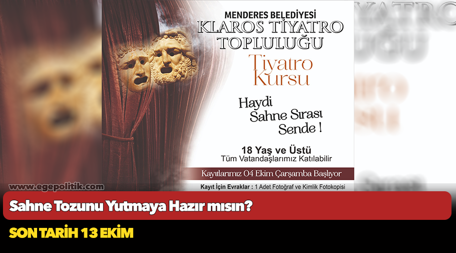 Menderes Belediyesi tarafından sürdürülen kültür sanat etkinlikleri kapsamında ‘’Haydi sahne sırası sende’’ sloganıyla tiyatro kursu gerçekleştirilecek. Ücretsiz olarak düzenlenecek kursa katılmak isteyen vatandaşlar için başvurular alınmaya başlandı.