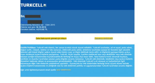 HALİL KARABIYIK - Türk hacker Skorsky ve ekibi, Türkiye’ye yönelik siber saldırılara, Rusya devlet sitelerine ve Türkiye aleyhinde haber yapan Rus internet sitelerine tarihin en büyük saldırısını gerçekleştirerek yanıt vermesi, Rus hacker ekibinin canının yanmasına sebep oldu. Rus Hacker ekibi, her zaman ki gibi haince bir fikir düşünerek; Türkiye’nin en büyük iletişim operatörlerinden biri olan Turkcell adına sahte faturalar düzenleyip vatandaşlara mail yoluyla iletiyor. Gönderilen faturalara hiç beklenmedik şekilde dudak uçuklatan miktarlar yazılıyor ve faturanın altında ''Daha fazla ayrıntI görmek için tıklayınız'' ve ''Faturanızı kontrol edin'' gibi linkler bulunuyor. Amaçları faturanızı merak ettirip linklere tıklamanız, linklere tıkladığınız taktir de hain tuzaklarının içine çekerek gerçekleşen bu siber savaşta sizleri kullanmak. Linklere kesinlikle tıklamayınız.