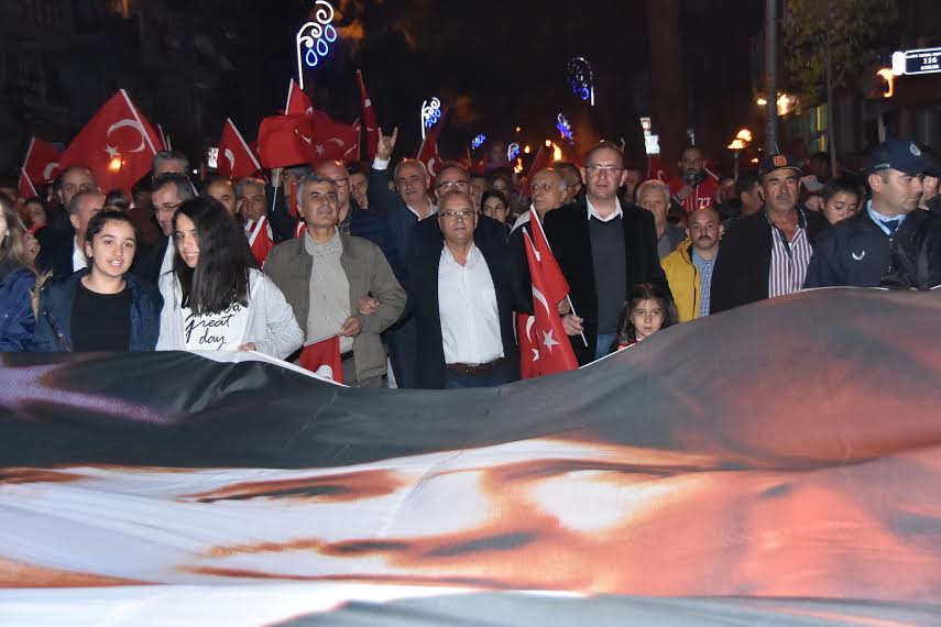 Atatürk Anıtından Kent Meydanına kadar ellerindeki Türk bayrakları, fener ve meşalelerle marşlar söyleyerek Şüheda ve Kurudere Caddesi üzerinden yürüyen kalabalığa, evlerinin balkon ve pencerelerinden vatandaşlar sevgi gösterisinde bulundu. Kent Meydanında fener alayı yürüyüşünü tamamlayan binlerce Salihlili, saygı duruşunda bulunarak hep birlikte İstiklal Marşı okudu.