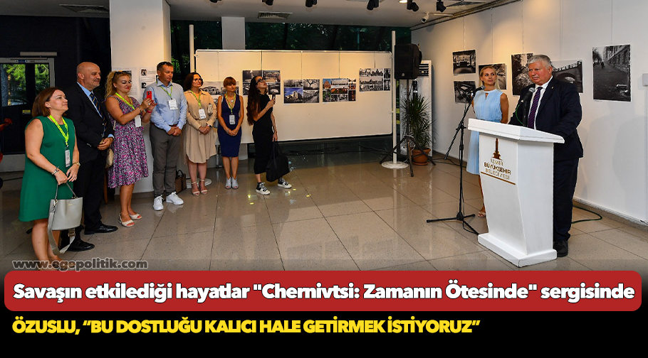 Serginin açılışında konuşan İzmir Büyükşehir Belediyesi Başkan Vekili Mustafa Özuslu, bu sergi ile birlikte Chernivtsi’nin zengin tarihini, direnişini ve dayanıklılığını gözler önüne seren farklı objektiflerin yansımasından bir yolculuğa çıktıklarını söyledi. Türkiye ile Ukrayna arasındaki tarihi bağların asıl malzemesinin uluslararası çıkarlar değil asla kopmayacak kültürel benzerlikler ve özdeş duygular olduğunu ifade eden Özuslu, “Bu sergi belki de sırf bu nedenle çok kıymetli. Buraya gelen heyetle, İzmir ve Ukrayna arasındaki bağların daha da güçlendirilmesi için ortak iradeyi konuştuk. Bu dostluğu kalıcı hale getirmek istiyoruz. Ancak dostluğu yaşatacak olan şey protokollerden ziyade bizim kalplerimizdeki sevgidir. Onu da burada görüyoruz. Chernivtsi ve İzmir arasındaki kültürel etkileşimi ve dayanışmayı sürdürmek adına önemli bir adım olan ‘Zamanın Ötesinde’ sergisine katkı sunan herkese teşekkür ediyorum. İki şehir arasındaki ilişkilerin daha da güçlenmesini temenni ediyorum” diye konuştu.