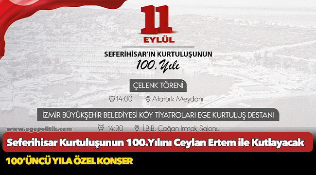 Aynı günün akşamı ise Seferihisar kapalı pazar yerinde “100’üncü yıl özel konseri” düzenlenecek. Kurtuluşa özel düzenlenecek konser 21:00'de başlayacak. Konserde sahne alacak sevilen sanatçı Ceylan Ertem Seferihisarlılara unutulmaz bir gece yaşatacak.