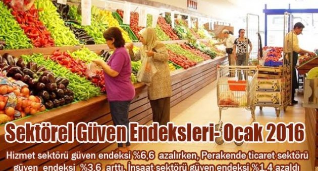 Türkiye İstatistik Kurumu Sektörel Güven Endeksini açıkladı. Hizmet sektörü güven endeksi yüzde 6,6 azaldı. Mevsim etkilerinden arındırılmış hizmet sektörü güven endeksi 2015 Aralık ayında 99,02 iken, 2016 Ocak ayında 92,53 değerine düştü. Hizmet sektörü güven endeksindeki bu azalış; son üç aylık dönemde iş durumunun iyileştiğini, hizmetlere olan talebin arttığını değerlendiren ve gelecek üç aylık dönemde hizmetlere olan talebin artacağını bekleyen girişim yöneticisi sayısının azalmasından kaynaklandı.