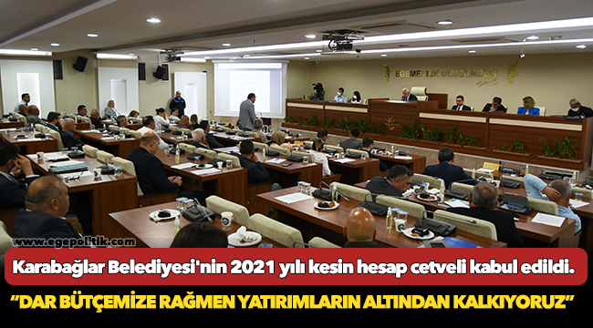 Karabağlar Belediye Meclisi'nin mayıs ayı ikinci toplantısı, Karabağlar Belediye Başkanı Muhittin Selvitopu yönetiminde gerçekleştirildi. 2021 yılı kesin hesap cetvelinin görüşüldüğü toplantıda Başkan Selvitopu, dar bütçeye rağmen önemli yatırımların altından kalkmayı başardıklarını vurgulayarak, “Türkiye'de bütçe gelir gider dengesini istikrarlı hale getiren, yatırım yapan belediyelerden biriyiz” dedi.