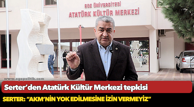 AKM önünden açıklama yapan Serter, Ege Üniversitesi Atatürk Kültür Merkezi’nin, kentin kalbinde yer aldığını ve hayata geçtiği 42 yıllık süreçte şehrin kültür ve sanat hayatı için çok büyük önemli bir mekan olduğunu vurguladı. Serter, açıklamasında, “Burası İzmir’in kültürünün can damarı. Benim üniversite yıllarım olan 1980 yılında kurulmuş bir kültür merkezimiz. İçerisinde 3-4 salonu barındıran bin 500 kişiyi misafir eden, alt katında sergi salonları, holleri ve ofisleri olan muhteşem bir yer. Bu kültür merkezinin son dönemde valilik tarafından emniyet müdürlüğüne verilmesi söz konusu diye duydum. O yüzden buradayım. Burası İzmirliler için bir can damarıdır. Kesinlikle burasını kültür merkezi haricinde İzmir’de hiç kimse bir şekilde kullanma hakkına sahip değildir” diye konuştu.