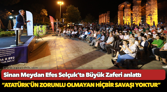 Kurtuluş Savaşı zaferinin ve Atatürk’ün bazı odaklar tarafından unutturulmaya çalıştığını belirten Sinan Meydan; “Tarihi gerçekleri silemezsiniz, tarihi yeniden yazamazsınız. Mustafa Kemal Atatürk, adını dünya tarihine İstiklal Savaşı ile altın harflerle yazdırmıştır. O adı silmek mümkün değildir. İsmet Paşa Lozan’a gittiğinde savaşta kazandığımızı masa başında da tüm dünyaya kabul ettirmiştir. İsmet Paşa’nın Lozan’dan döndüğü trenin üzerinde “sulh” yazıyordu. Biz Türk tarihinin en uzun süreli barış döneminde yaşıyoruz. Etrafımızda her yerde savaş var. Ama bir ülke bu kan gölünün ortasında bütün problemlere rağmen halen barış içinde yaşamaya devam ediyor. O ülke, Mustafa Kemal Atatürk’ün yeniden vatan yaptığı, İsmet Paşa’nın yeniden tapusunu aldığı Türkiye Cumhuriyeti’dir. Şunu da unutmayın; Büyük Taarruz bizim için hakkı meşru bir savaştır. Mustafa Kemal; “Savaş zorunlu olmadıkça bir cinayettir” diyor. Bununla gurur duyalım ki; Atatürk’ün zorunlu olmayan bir savaşı yoktur. Çanakkale’de, Sakarya’da, Büyük Taarruz ’da hepsinde canını, özgürlüğünü, ülkesini, namusunu korumuştur” dedi.