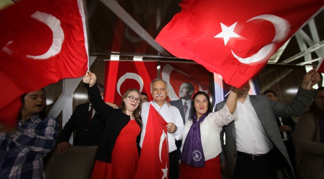 Başkan Karabağ’ın coşku dolu konuşmasını kadınlar ayakta alkışladı. İzmir ve 10. Yıl marşlarının çalınmasıyla salondaki kadınlar ellerindeki Türk bayraklarını sallayarak, renkli görüntüler oluşturdu. Etkinliğe katılan down sendromlu çocukların ilgisinden memnuniyet duyan Karabağ, bol bol hatıra fotoğrafı çektirdi.