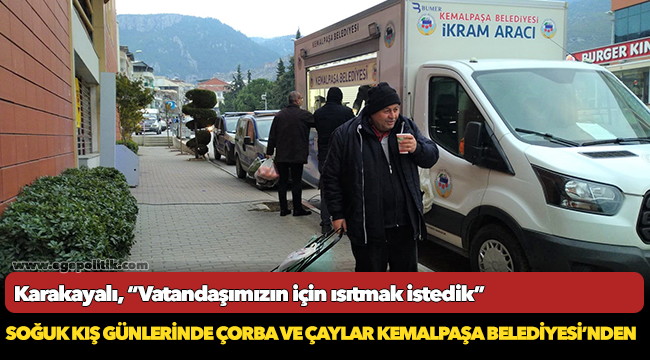 Hazırlanan sıcak çorba ve çayların sokaklarda, meydanlarda ikram aracı aracılığıyla dağıtılacağını belirten Kemalpaşa Belediye Başkanı Rıdvan Karakayalı,“Belediye personellerimiz tarafından pişirilen sıcak çorba ve çaylarımızı hem ihtiyaç sahibi hem de işlerine, okullarına giden vatandaşlarımıza da sıcak çorba ikramı yapıyoruz. Bu soğuk kış aylarında ağırlık verdiğimiz çalışmamızda vatandaşlarımızın içlerini ısıtmak istedik. Halkımız, yaya trafiğinin yoğun olduğu noktalarda, okullarda öğrencilerimize dağıttığımız çorbalarla güne başlıyor. Haftada 3 gün düzenli olarak devam ettiğimiz ikramımıza sıcak çorba çeşitleriyle 2 ay boyunca devam edeceğiz. Vatandaşlarımıza afiyet olsun” dedi.