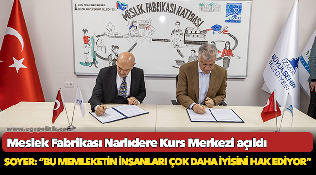 İzmir Büyükşehir Belediye Başkanı Tunç Soyer, kentteki işgücü potansiyelini attırmak için faaliyet gösteren Meslek Fabrikası’nın Narlıdere’deki yeni kurs merkezinin kurdelesini kesti. Yirmi beşinci merkezi açtıklarını belirten Başkan Soyer, “Gençlerimizin yüzde 60’ı geleceğini bu memlekette görmüyor. Ancak bu bir kader değil. Biz bunu değiştireceğiz. Bu memleketin insanları çok daha iyisini hak ediyor” dedi.