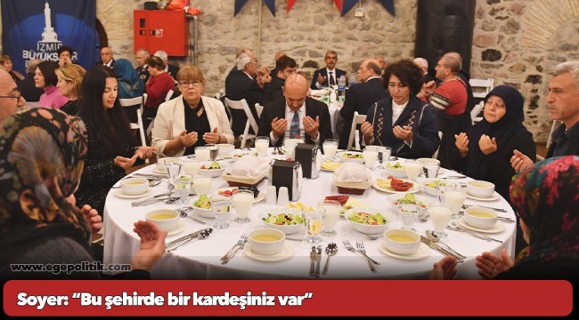 İftar yemeğinde şehit aileleri ve gazilere seslenen Başkan Tunç Soyer, ''Eğer görevimiz devam etseydi daha yapacaklarımız çoktu. Ama şu kadarını söyleyeyim. Emin olun ki son nefesime kadar gururunuzu, acılarınızı paylaşacak bir kardeşiniz var. İzmir'de yaşamaya devam edecek ve her neye gücü yeterse sizin için onu yapmaya devam edecek bir kardeşiniz var. Hepinizi en içten saygılarımla selamlıyorum. İyi ki varsınız. Hepinizin şimdiden bayramı mübarek olsun'' dedi.