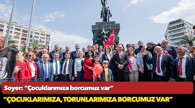 23 Nisan'ın Gazi Mustafa Kemal Atatürk’ün çocuklara verdiği değerin bir ifadesi olduğunu söyleyen Soyer, “Bizler, onun izinden yürüyerek her şeyden çok çocuklarımıza sahip çıkıyoruz. Onların hayallerinin gerçek olduğu bir ülke için canla başla çalışıyoruz. Çocuklarımıza bu günleri armağan etmemize çok az kaldı. O kadar çok kaybımız var ki. Bu mücadele ile yitip gidenler var. Sebahattin Ali’lerden Deniz Gezmiş’lere, Gezi’deki geçlere; Mustafa Kemal Atatürk’ten başlayarak tüm adalet sevdalılarına, Madımak’ta yanan canlara, vicdan sahiplerine, adalet uğruna hayatını kaybeden tüm kahramanlara borcumuz var. Ama bir de çocuklarımıza, torunlarımıza borcumuz var. İşte bugün, 23 Nisan Ulusal Egemenlik ve Çocuk Bayramımız’da her birine söz veriyoruz. Bu memlekete refahı, adaleti ve özgürlüğü getireceğiz. Yaşasın milletimizin kayıtsız şartsız egemenliği; yaşasın 23 Nisan” diye konuştu.