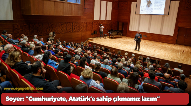 Serginin ardından Başkan Soyer, tarihçi yazar Sinan Meydan ile “Cumhuriyet’in 100. yılında Atatürk’ü Anlamak” adlı söyleşiye katıldı. Etkinlikte konuşan Başkan Tunç Soyer, “Cumhuriyet olağanüstü bir devrim. Dünyada şiddet kullanılmadan, kan dökülmeden yüz yıldır devam ettirilen büyük bir devrim. Fakat bu devrimin şöyle bir özelliği var. İnsanları rahata, konfora çok alıştırıyor. Cumhuriyet ve barış o kadar güzel şeyler yaşatıyor ki bazen değerini bilmiyoruz. Tarihten ders çıkaran başkaları, başka bir şey yapmaya başlıyor. İzmir Rıhtımı, Sümerbank satılabiliyor. Bunlar bir gecede, bir mahkeme kararı ile Anayasa Mahkemesi yok sayılarak karar verilebiliyor. Onun için Cumhuriyete, Atatürk’e sahip çıkmamız lazım” dedi.