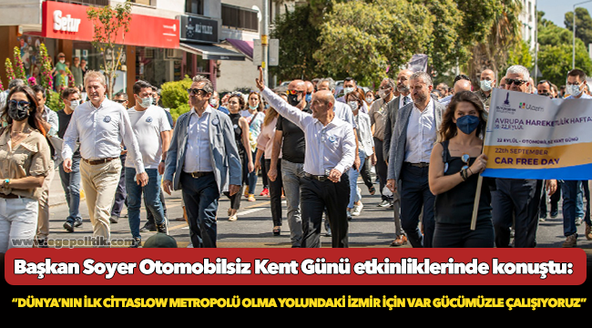 İzmir Büyükşehir Belediye Başkanı Tunç Soyer 22 Eylül Otomobilsiz Kent Günü’nde düzenlenen yürüyüşe katıldı. “Otomobilsiz ve İnsan için Kentler Söyleşisi’nde konuşan Soyer “Şehirleri, insanların içinde huzurlu yaşayacağı alanlar olarak tasarlamak gerekiyor. Dünya’nın ilk Cittaslow Metropolü olma yolundaki İzmir’in içinde keyifle yürünebilen bir kent olması için var gücümüzle çalışıyoruz” dedi.