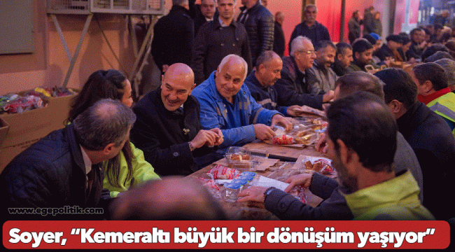 İşçilerle buluşmasında Kemeraltı’nın ilk defa böyle köklü ve büyük bir yatırıma sahne olduğunu söyleyen Büyükşehir Belediye Başkanı Tunç Soyer, “Bu sizlerin ellerinde, emeğiyle gerçekleşiyor. Birçoğunuz gece çalıştı. Yorucu bir çalışma oldu. Ama emin olun her biriniz geleceğe çok kıymetli iz bıraktınız. Hepinizin emeğine sağlık” dedi.