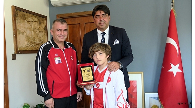 Karate Antrenörü Kudret Yüksel ve Küçük Karateci Kaan Yüksel; Belediye Başkanı Gökhan Demirağ’a, Foça’daki karate sporu faaliyetlerine destek ve katkılarından dolayı teşekkür plaketi sundu.
