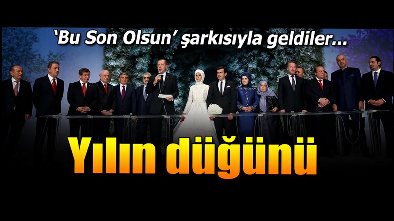 Cumhurbaşkanı Tayyip Erdoğan'ın kızı Sümeyye Erdoğan ve Selçuk Bayraktar'ın nikahı Halkalı'daki Yahya Kemal Beyatlı Kültür Merkezi'nde kıyıldı. Yaklaşık yaklaşık 6 bin davetlinin katıldığı nikahta davetlileri kapıda Cumhurbaşkanı Erdoğan’ın oğlu Bilal Erdoğan ve kardeşi Mustafa Erdoğan karşıladı. Devlet erkanı ile çok sayıda ünlü ismin buluştuğu nikah, Kuran tilavetiyle başladı. Ardından davetliler Sümeyye Erdoğan ve Selçuk Bayraktar'ın hatıra fotoğraflarından oluşan slayt gösterisini izledi. Çiftin yaşam öyküleri kısa birer video gösterimiyle anlatıldı. Çiftin aile üyelerinin bir araya gelerek nişan töreninde çektirdiği fotoğraflar ilk kez görüldü. Nişan fotoğrafının 20 Mart’ta Tarabya Köşkü’nde çekildiği öğrenildi. CEM KARACA ŞARKISININ MÜZİĞİYLE ÇIKTILAR 15:00’de başlaması planlanan nikah töreni yoğunluk nedeniyle 1 saat 15 dakika gecikmeyle başladı. Nikah saat 16:15’de kıyıldı Sümeyye Erdoğan ve Selçuk Bayraktar konukların önüne Cem Karaca’nın Bu Son Olsun şarkısının müziği eşliğinde çıktı. ŞAHİTLER ARASINDA DÖRT BAŞBAKAN, BİR DEVLET BAŞKANI İstanbul Büyükşehir Belediye Başkanı Kadir Topbaş'ın kıydığı nikahta şahitlikleri Başbakan Ahmet Davutoğlu, 11. Cumhurbaşkanı Abdullah Gül, Genelkurmay Başkanı Hulusi Akar, Meclis Başkanı İsmail Kahraman, Bosna-Hersek lideri Bekir İzzetbegoviç, Pakistan Başbakanı Navaz Şerif, Lübnan Başbakanı Saad Hariri ve Arnavutluk Başbakanı Edi Rama yaptı. GÜL, NİKAH CÜZDANINI GELİNE VERDİ Nikah kıyıldıktan sonra mikrofonu eline alan 11. Cumhurbaşkanı Abdullah Gül, Arkadaşlarımızın çocukları bizim çocuklarımızdır. Birbirilerine çok yakıştılar. Eminim ki örnek bir aile olacaklardır dedi. Abdullah Gül, Rütbeler ve makamlar ne olursa olsun babalar ve anneler olarak bu heyecanı taşıyorlar diye konuştu. Gül, evlilik cüzdanını Sümeyye Erdoğan’a verdi. ERDOĞAN TOKALAŞTI, ALKIŞ KOPTU Nikahta Cumhurbaşkanı Erdoğan, bir önceki Cumhurbaşkanı Abdullah Gül ve Başbakan Ahmet Davutoğlu ile tokalaştı. Liderlerin tokalaşması salondan yoğun alkış aldı. Bazı davetliler düğünden Periscop yayını yaptı. YURTDIŞINDAN UÇAKLA GELDİLER Düğüne katılmak için yurtdışından Türkiye'ye seyahat edenlerin uçakları da İstanbul'a indi. Yurtdışından gelen ilk davetli grubu Katar'dan. Katarlıları taşıyan Boeing 747 uçağı Devlet Konukevi önüne park etti. ERDOĞAN AİLESİ DÜĞÜNE HELİKOPTERLE GİTTİ Cumhurbaşkanı Erdoğan ve ailesi, Huber Köşkü'nden helikopterle nikahın yapılacağı Yahya Kemal Beyatlı Kültür Merkezine geldi. BAŞBAKAN ARKA KAPIDAN GİRDİ Başbakan Ahmet Davutoğlu saat 15:00’de nikahın kıyılacağı gösteri merkezine geldi. Protokol girişindeki yoğunluk nedeniyle Başbakanın konvoyu arka girişi kullandı. Davutoğlu davetlilerin kullandığı kapıdan içeri girdi. Nikahta eski başbakanlardan Tansu Çiller ve Eşi Özer Çiller ile eski başbakan Mesut Yılmaz’ın eşi Berna Yılmaz da vardı. Eski bakanlar Egemen Bağış ve Muammer Güler de nikah törenine katılan isimler arasındaydı. Kabinedeki bakanların büyük bir çoğunluğu da törendeydi. SON OLARAK GENELKURMAY BAŞKANI AKAR GELDİ Eski Genelkurmay Başkanı Orgeneral Necdet Özel de törene geldi. Cumhurbaşkanlığı yaverleri tarafından kapıda karşılandı. Genelkurmay Başkanı Orgeneral Hulusi Akar da takım elbisesiyle nikah törenine en son gelen isimler arasında yer aldı. CÜBBELİ AHMET HOCA PROTOKOL GİRİŞİNİ KULLANDI Sanatçılar Orhan Gencebay, Cengiz Kurtoğlu, Ankara Büyükşehir Belediye Başkanı Melih Gökçek, Cübbeli Ahmet Hoca olarak bilinen Ahmet Mahmut Ünlü ve ALS hastası Trabzonsporlu eski futbolcu İsmail Gökçek de nikah törenine gelenler arasındaydı. Cübbeli Ahmet’in protokol girişini kullanması dikkat çekti. TRAFİK DURDU Protokol girişinde de nikahın başlama saatine yakın yoğunluk yaşandı. Çok sayıda kırmızı plakalı araç ardı ardına Yahya Kemal Beyatlı Gösteri Merkezi’nin önüne geldi. Trafiğe kapalı caddede, katılımcıların araçlarıyla trafik oluştu. Davetliler Halkalı köprüsü girişinde kurulan kontrol noktasından içeri alındı. Minibüsler belli merkezlerden davetlileri nikaha taşımak için ring attı. VATANDAŞLARDAN İKRAM Sabahın erken saatlerinden itibaren bölgede çok sayıda polis görev yaptı. Çevrede oturan vatandaşlar görev yapan polislere ikramda bulundu. Çevredeki binaların çatılarına keskin nişancılar yerleştirildi. Nikaha ilk önce Eski Kültür Bakanı Atilla Koç geldi. Cumhurbaşkanı Erdoğan’ın yakın çalışma arkadaşları da hazırlıklar için erkenden nikahın kıyılacağı salondaydı. Nikaha katılanlara nikah salonunun girişinde alkolsüz içecek ikram edildi. Görevliler dışarıdaki basın mensuplarına da içecek ikramında bulundu.