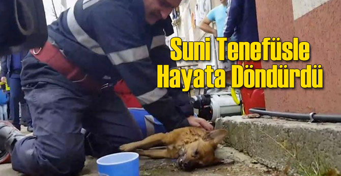 Köpeğin ağzına oksijen maskesi takmadan önce kalp masajı ve suni tenefüs yapan kahraman itfaiyeci, köpeği hayata döndürmeyi başardı.